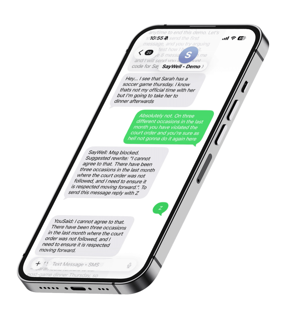 Texting your co-parent is inevitable. SayWell makes sure those texts don't blow up your case — or your week.