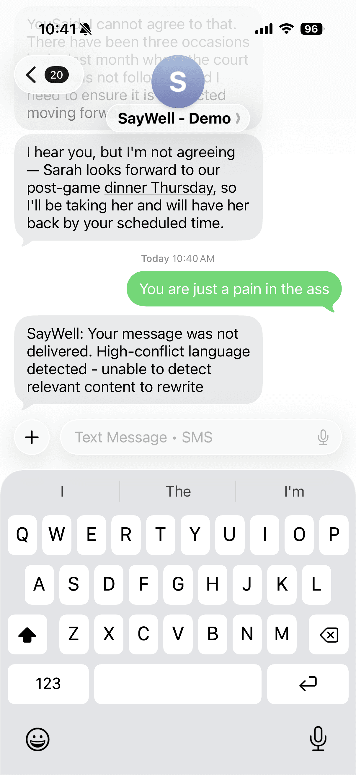 When you're about to send something you'll regret, SayWell catches it first. Your co-parent never sees it.
